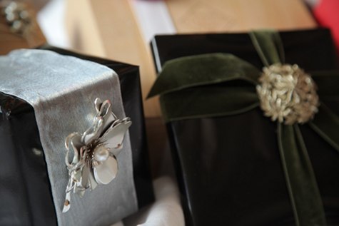Очередная идея – булавки, заколки, брошки. Здесь все проще простого, главное – это отыскать старые декоративные булавки, брошки, украшения с заколок и т.д. Из ткани нарежьте необходимое количество полосок (такой длиной, чтобы можно было обернуть подарочную коробку) и прикрепите к ним украшения.